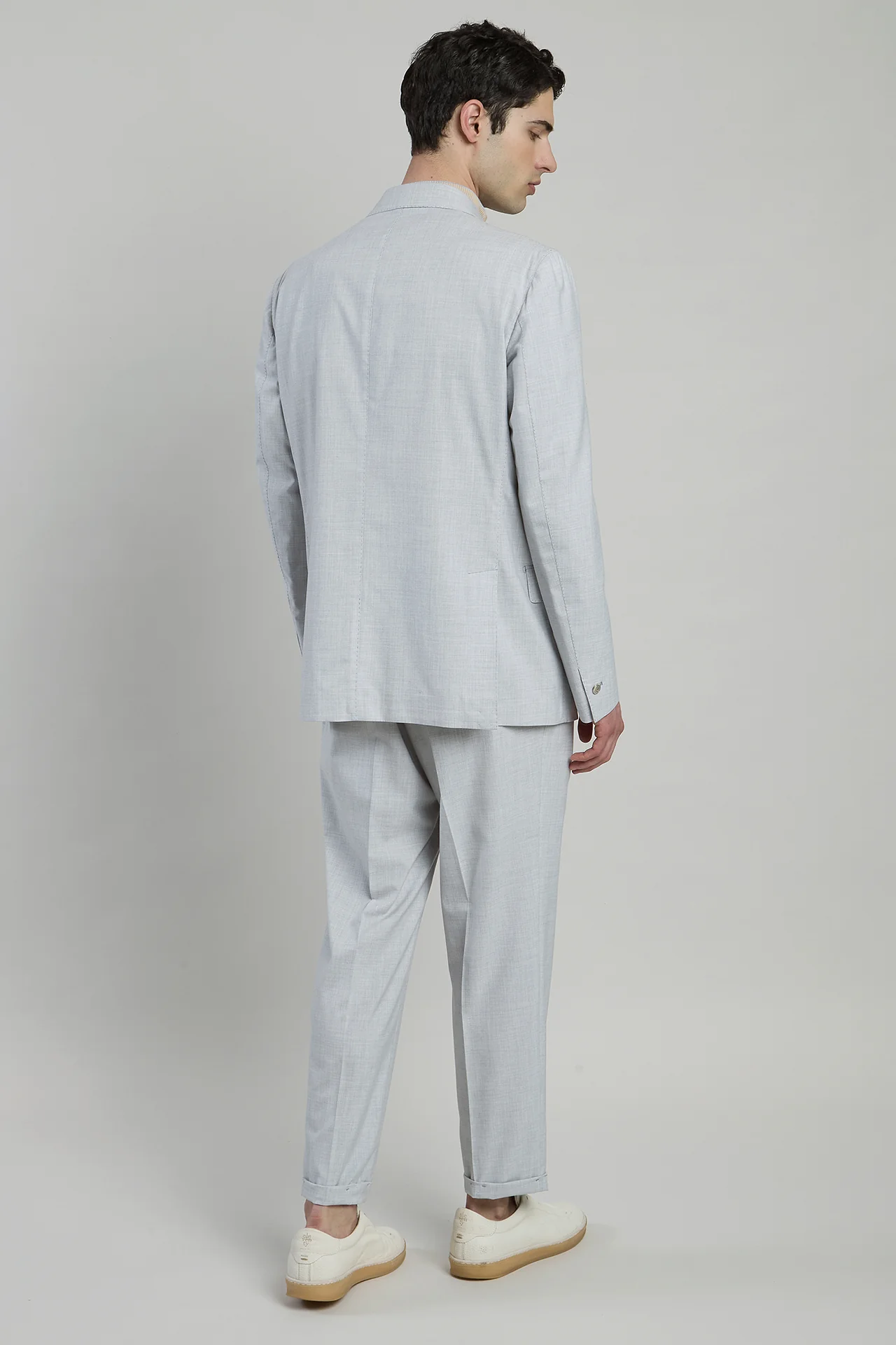 Abito doppiopetto in lana, cotone e seta, dalla vestibilità slim. La giacca punta lancia e ticket pocket con pattina è abbinata al pantalone due pinces, più morbido sul bacino. Realizzato interamente in Italia con passaggi a mano che richiedono circa dieci ore di lavorazione, l’abito è caratterizzato da un bottone singolo sulla manica, segno distintivo del brand, ispirato alla tradizione della sartoria napoletana.