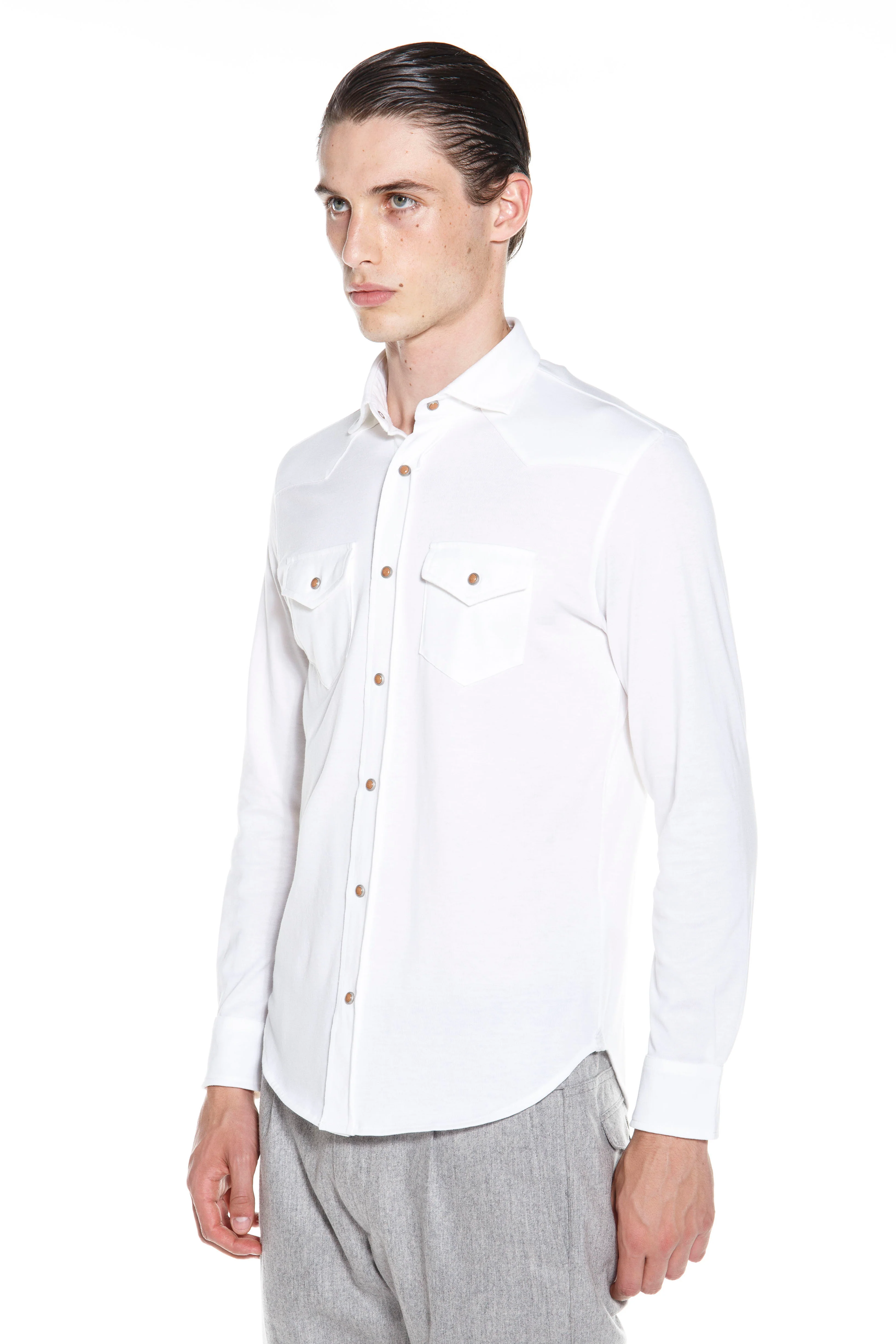 Il modello camicia texas maniche lunghe è realizzato in jersey di cotone comfort “Giza cotton”. Questa preziosa materia prima, nota anche come la regina dei cotoni egiziani, coltivata in ristrettissime aree nel delta del Nilo, è la fibra dal micron-aire più fine al mondo (2.8): un materiale con un’elevatissima resistenza, dalla brillantezza e dalla morbidezza straordinarie. Una quantità di fibra limitata e un alto costo di semina e di coltivazione preservano la qualità di un prodotto esclusivo. Le fibre di questo cotone, straordinariamente lunghe e setose, sono caratterizzate da un’alta resistenza e da una straordinaria morbidezza. Il dettaglio della mosca di colore grigio melange e dei bottoni automatici arricchiscono il capo, donandogli un gusto raffinato e moderno, tipico di Eleventy.Composizione