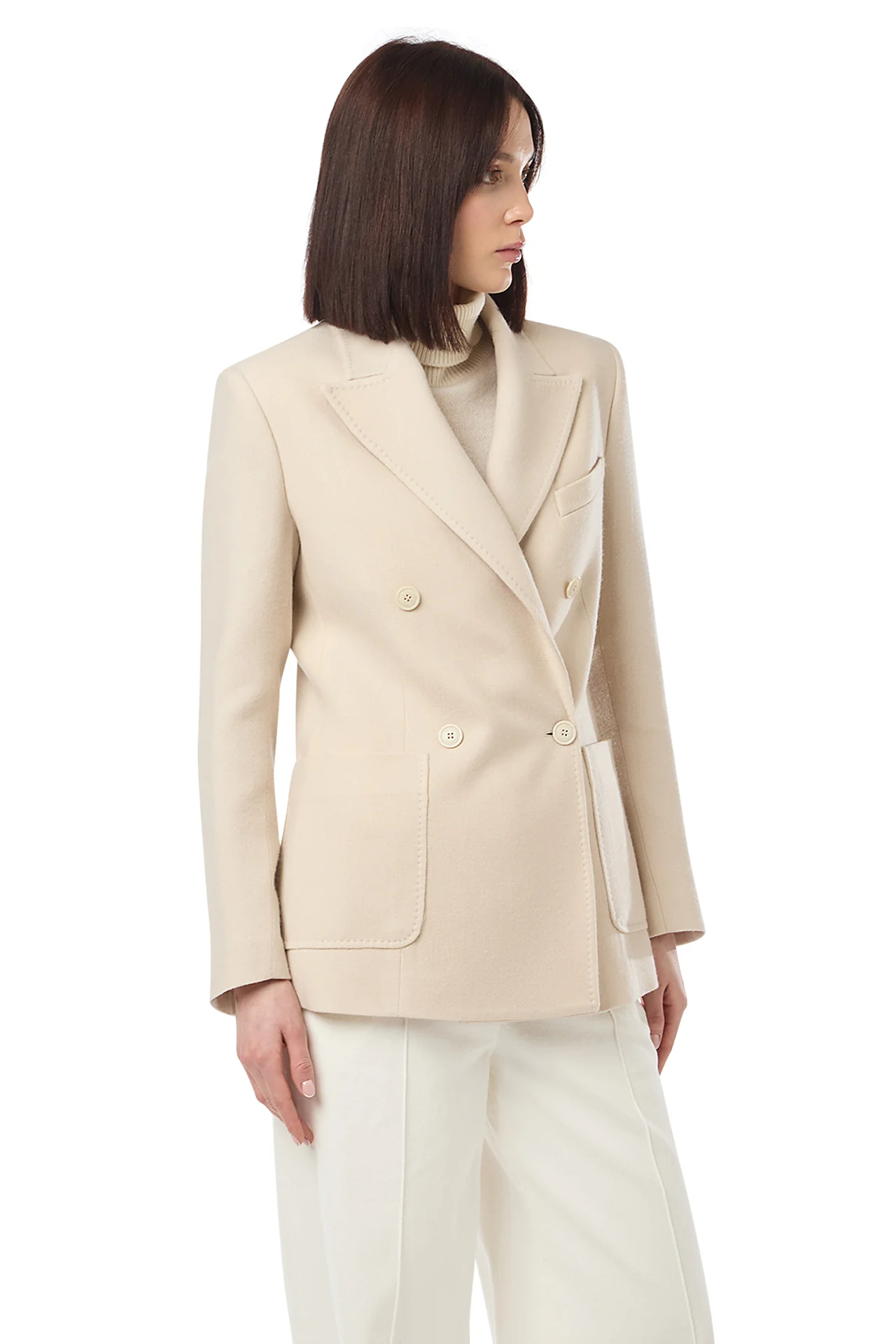 Giacca doppio petto tasca a toppa, realizzata con un tessuto molto pregiato in 100% cashmere. Il finissaggio rende speciale la mano di questo tessuto rendendola molto soffice al tatto.Select size