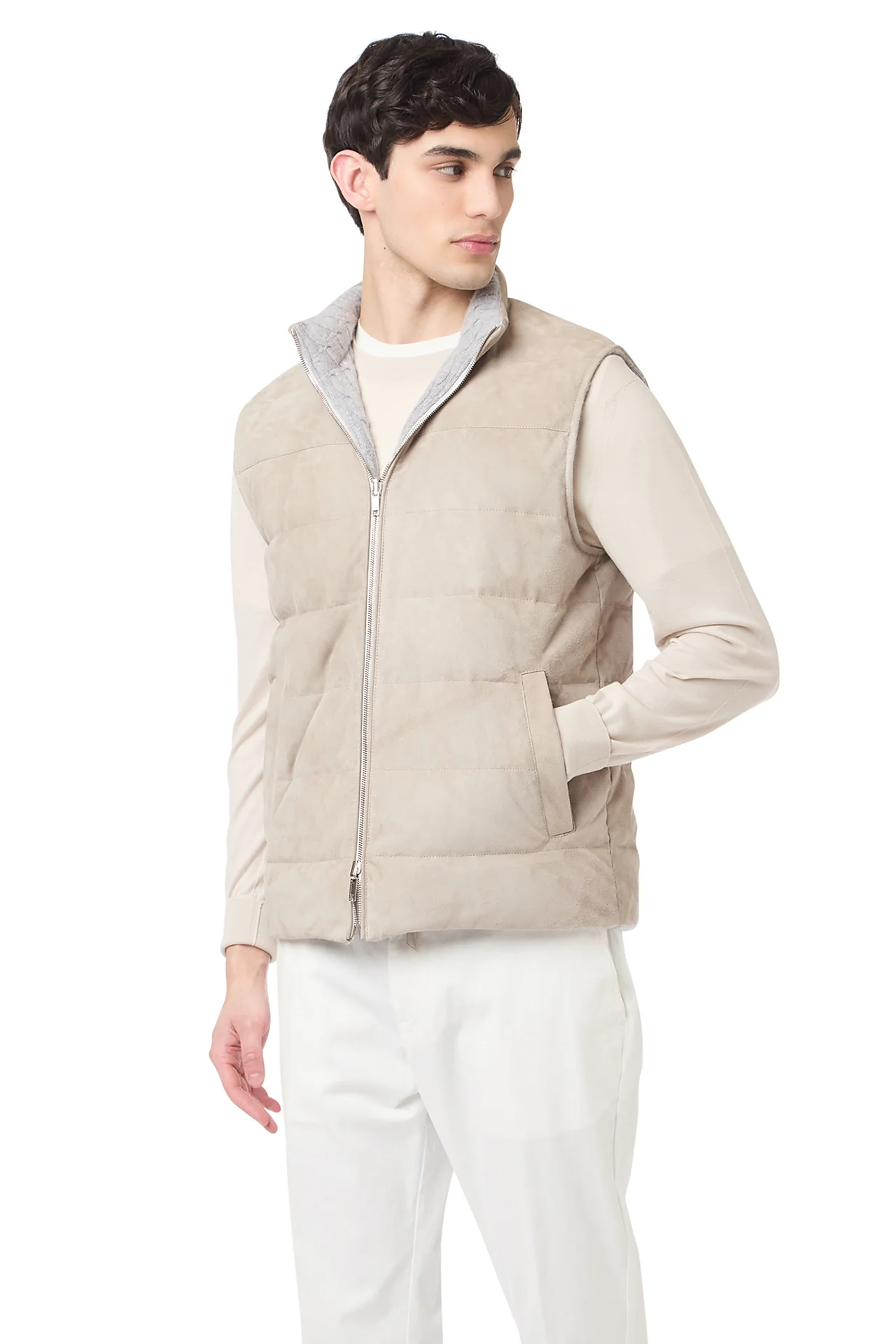 Gilet reversibile dalla vestibilitĂ regolare, realizzato in vellutato suede e jersey di lana e cashmere a treccia. Capo sportivo, ideale per la stagione invernale grazie alla calda imbottitura in piuma.