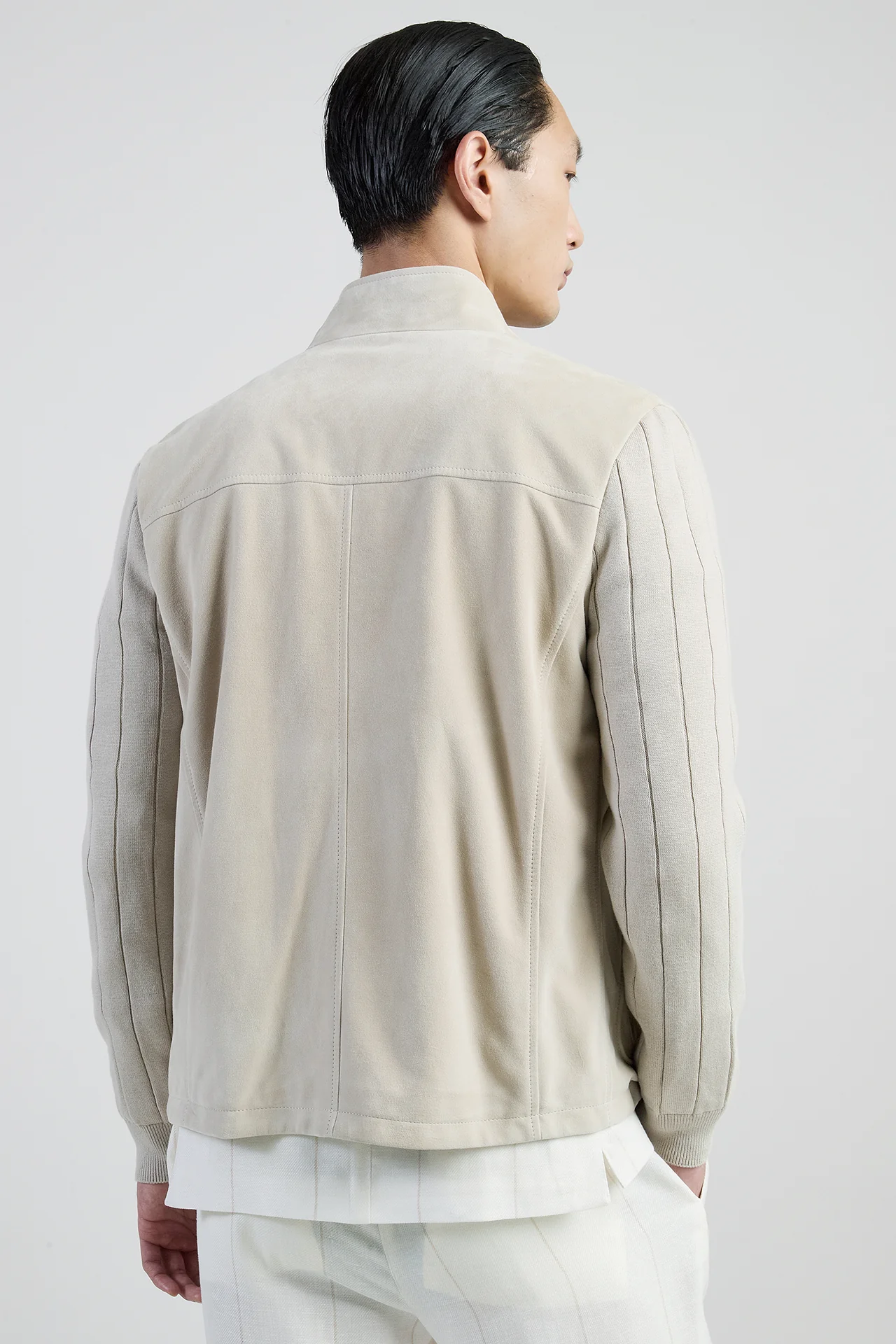 Giubbino bimaterico dalla vestibilitĂ regolare, realizzato in vellutato suede con maniche in maglia di cotone lavorata a coste. Capo dal sapore sportivo, con dettagli d'ispirazione college.