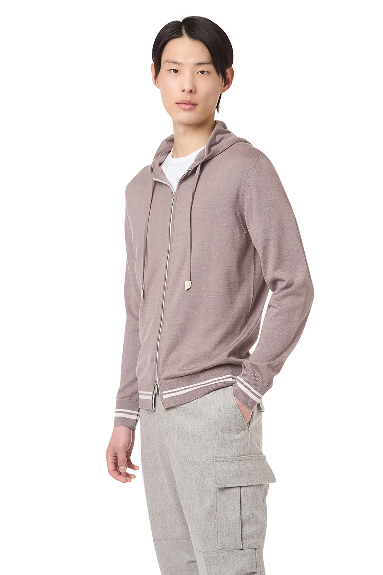 Maglia full zip con cappuccio in lana merinos e seta, finezza 18. Disegno a doppia riga su fondo e polsi e coulisse con finalini in alcantara per un capo dal design sportivo. VestibilitĂ regolare.