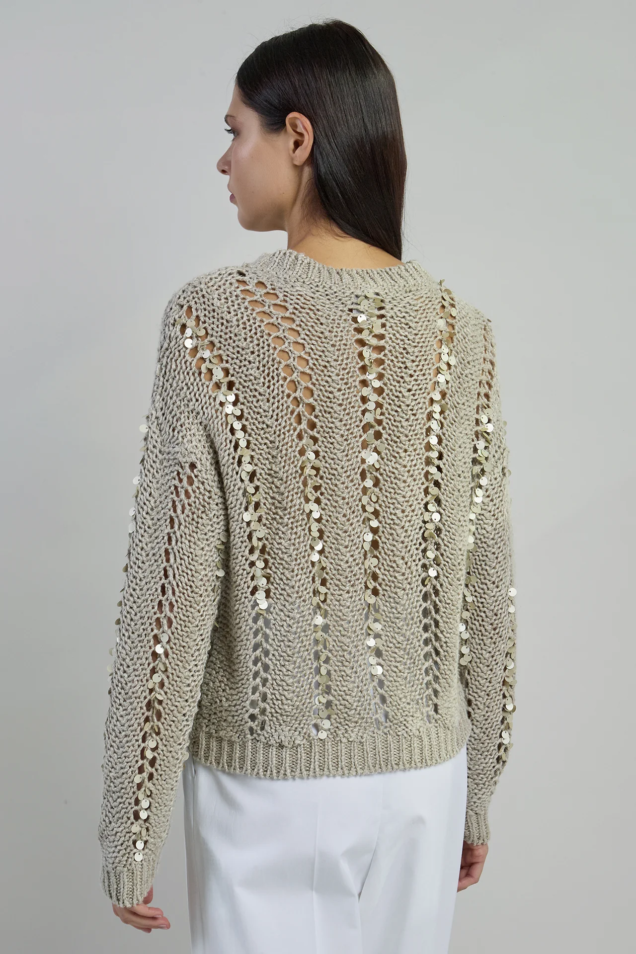 Maglia girocollo con punto aperto scaricato, realizzata con un particolare filato grezzo in 100% lino naturale su finezza 3. L'esclusiva lavorazione, arricchita da fili di paillettes cuciti a mano, rappresenta appieno l'eccellenza della tradizione manifatturiera italiana.