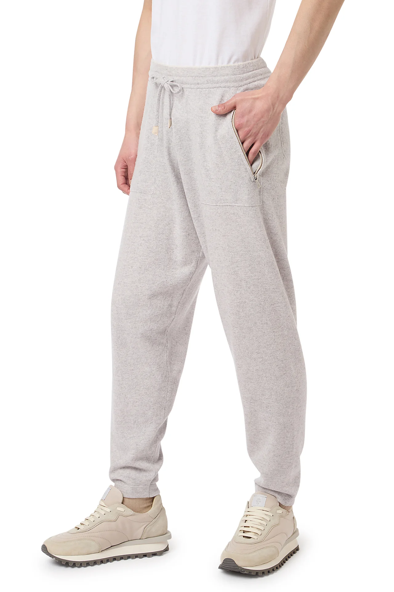 Pantalone jogger dalla vestibilitĂ regolare, realizzato cashmere finezza 12. Capo dal design sportivo con tipping a contrasto in vita e coulisse con finalini in alcantara.