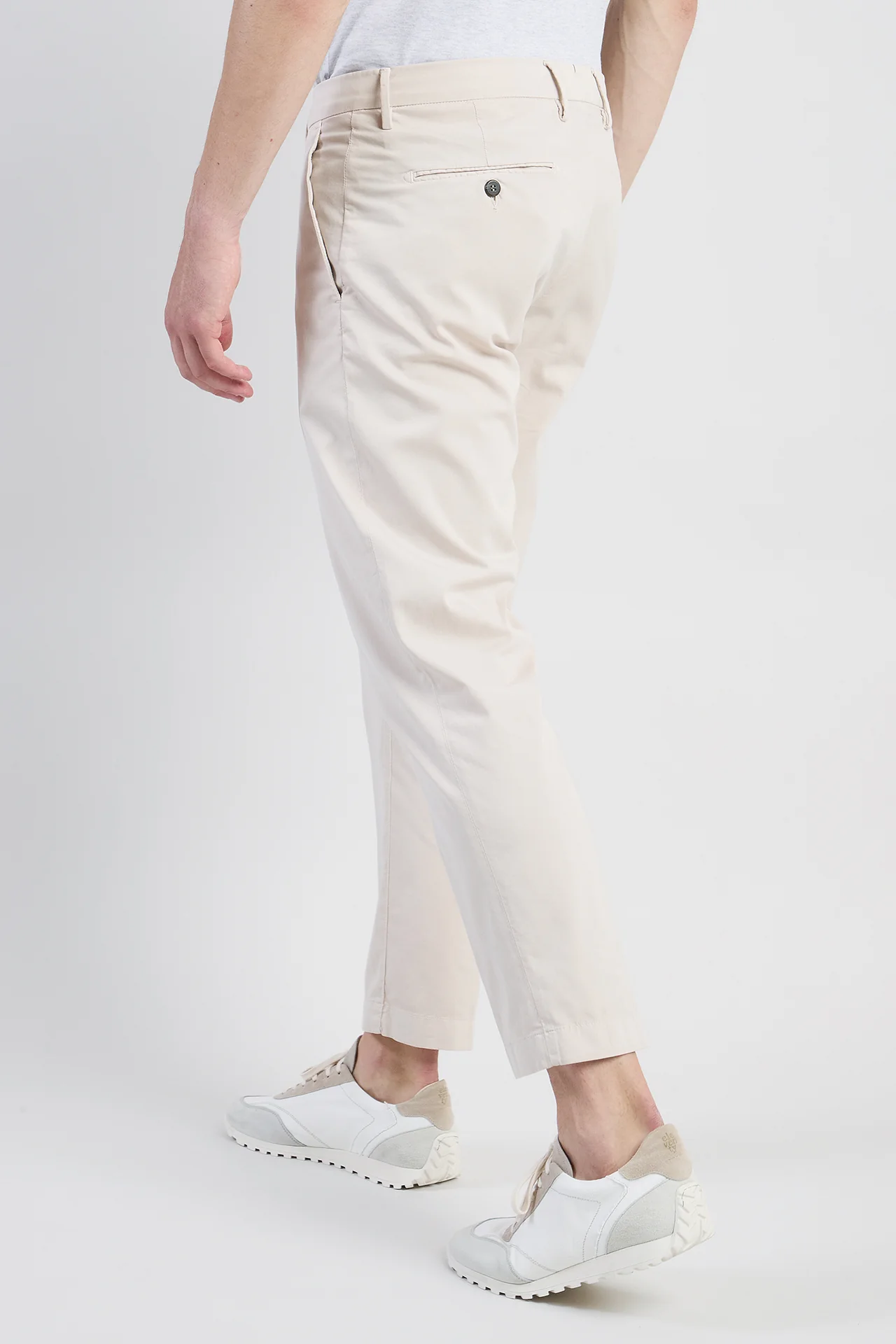 Pantalone chino in prezioso tessuto di cotone e seta tinto in capo, dalla vestibilitĂ regolare. La tintura in capo accentua le sfumature di colore in prossimitĂ delle cuciture conferendo un aspetto vissuto. Punti sartoriali impreziosiscono il capo.