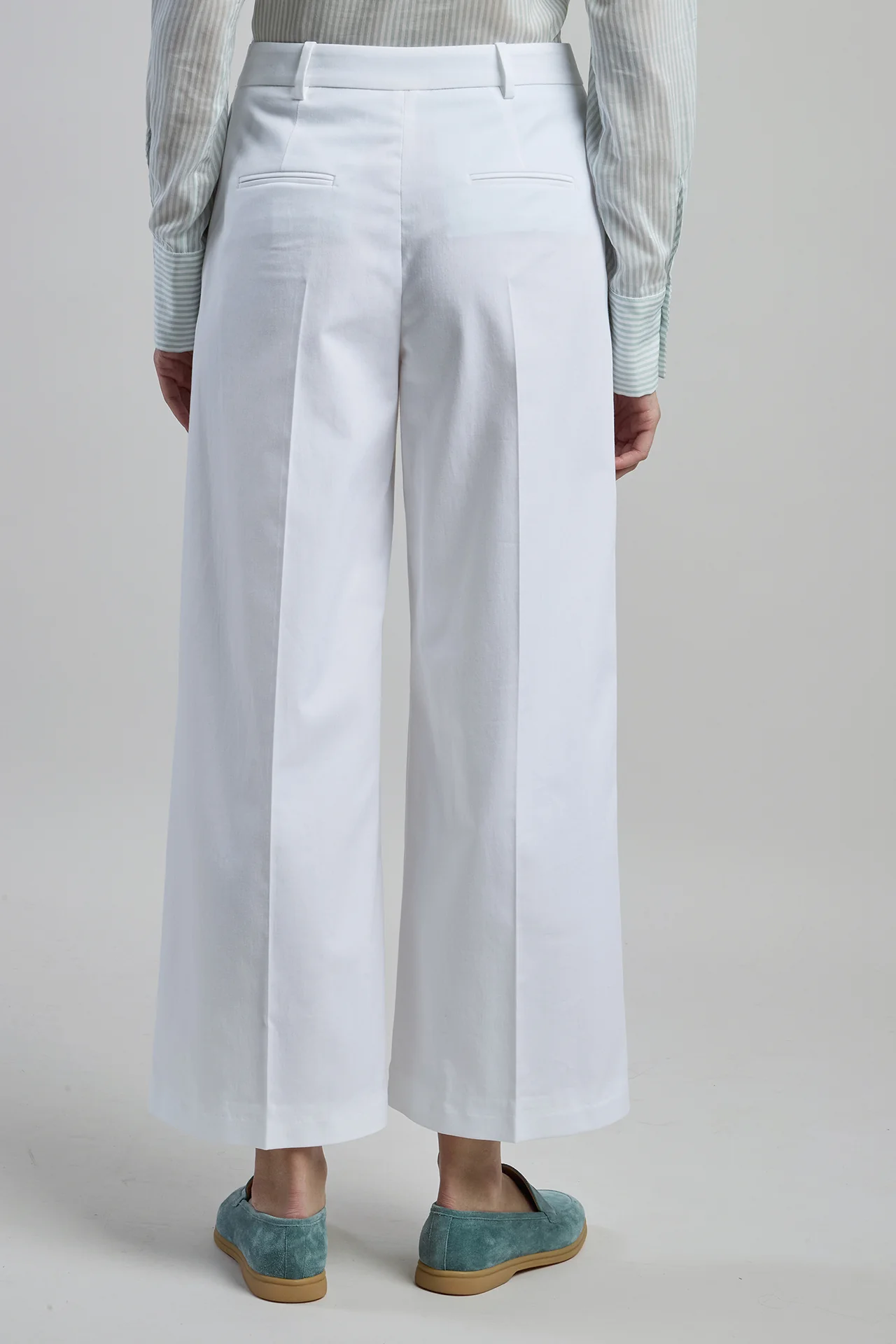 Pantalone palazzo con doppie cuciture a rilievo frontali, realizzato in cotone doppio ritorto tinto pezza elasticizzato, disponibile in colori esclusivi.