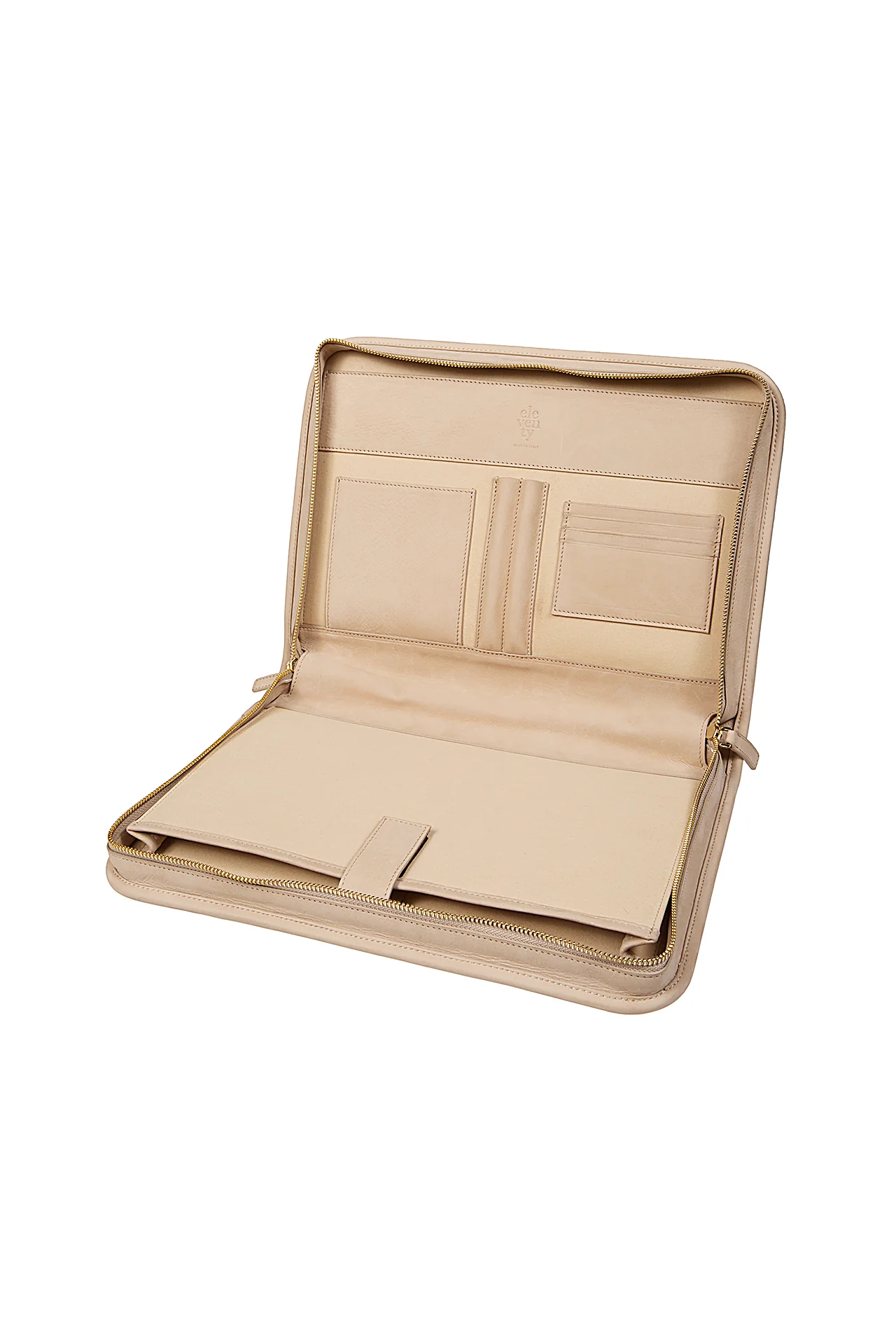 Porta iPad e computer 13" in tela di lana con inserti in pelle bovina e minuteria di colore oro. Il pellame di alta qualità si presenta estremamente morbido al tatto. I nastri regimental in cotone e la cura nella scelta dei materiali conferiscono un tocco chic e distintivo all’accessorio. Altezza cm 25, larghezza cm 35, profondità cm 5.