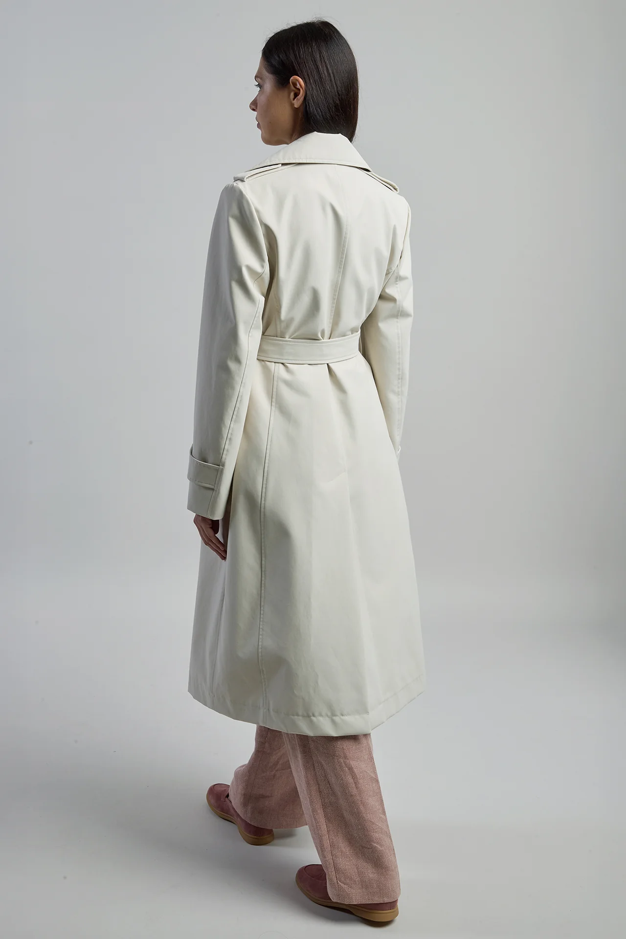 Trench lungo con cintura, realizzato in nylon doppia faccia con trattamento WR anti-acqua, ideale per affrontare anche giornate di pioggia e vento.